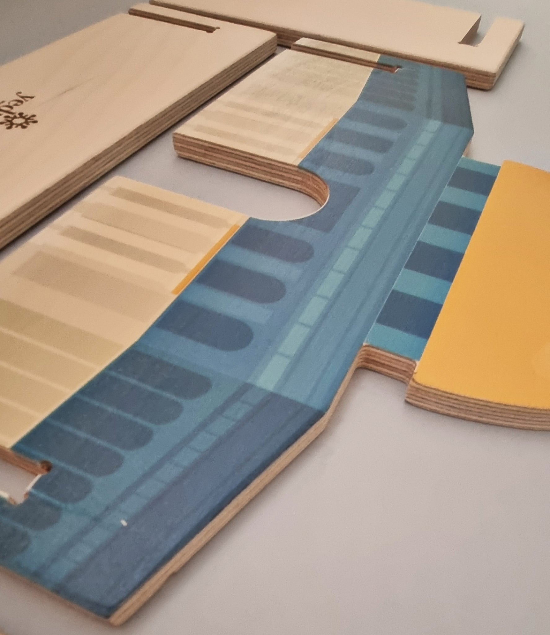 Each piece has been hand cut and shaped to slot together as a mosque. The large front piece is printed with a colourful design, depicting Al Aqsa mosque, which matches our masjid balance toys.