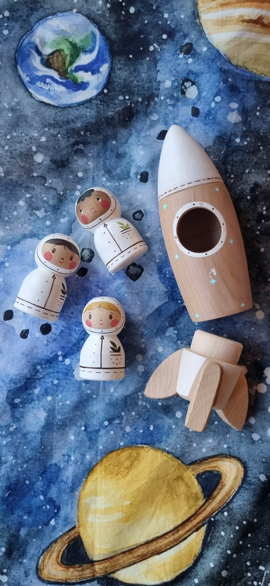 Each rocket can be gently opened and the wooden peg doll astronauts fit inside to see out through the window.