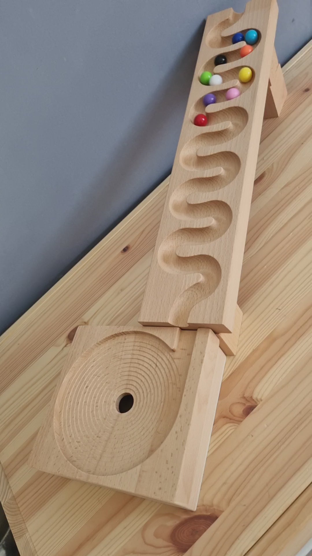 Size: Snaking channel 43 x 8.5 cm, spiral box 15.5 x 14, marble catching box 14.5 x 15.5 cm, straight channel 28.5 x 5 cm, blocks 5 x 5 cm and varying thicknesses.