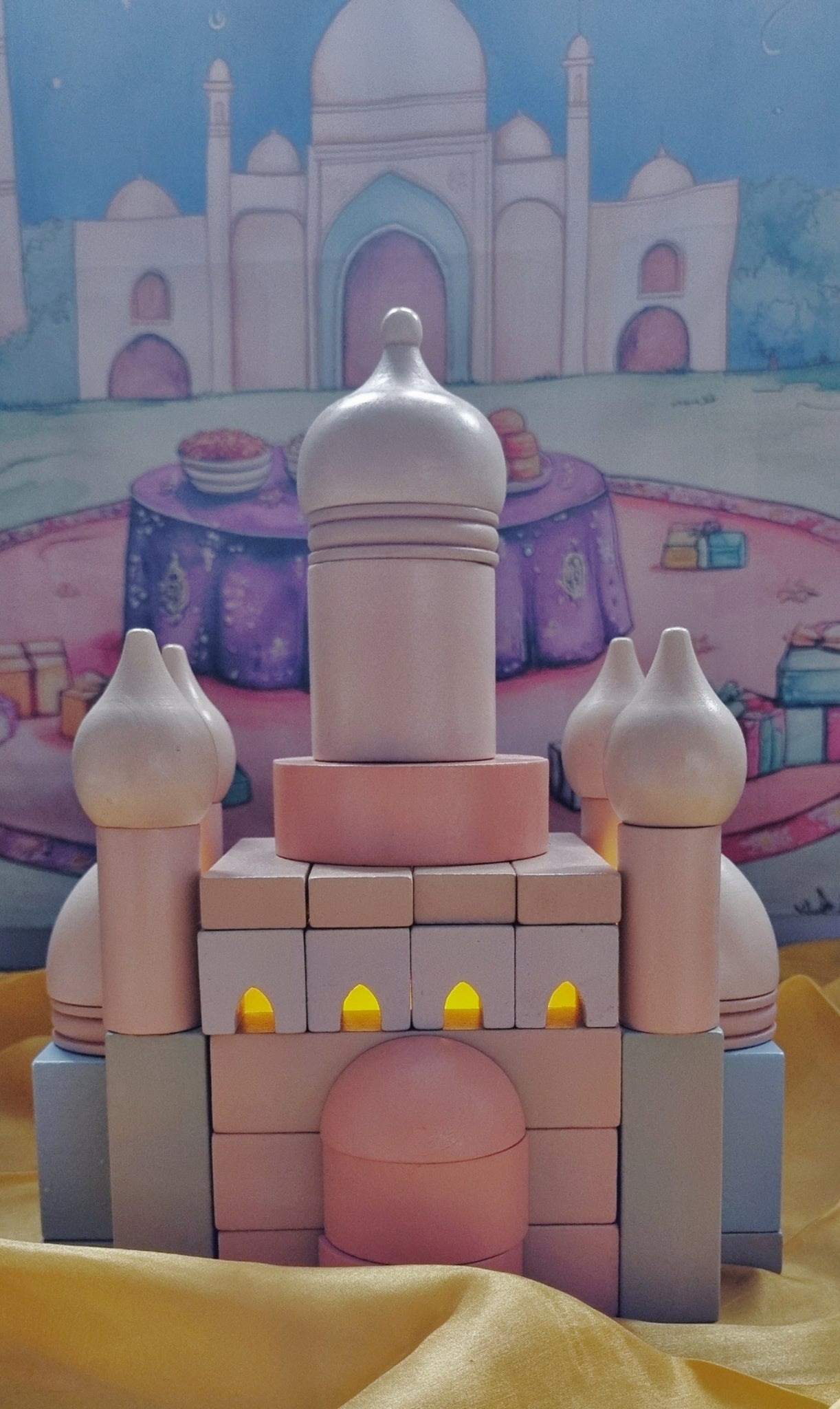55 piece Wooden Church/ masjid building blocks set in pastel colours .